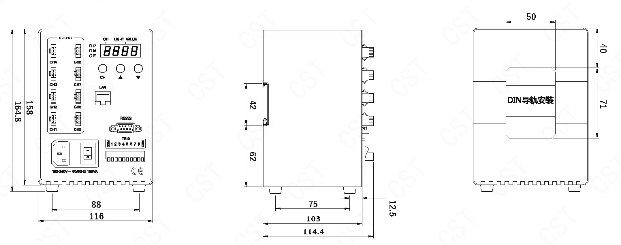CST 康视达 CST-CPL2496C-8TD 可编程恒流控制器 产品型号 CST-CPL2496C-8TD 驱动方式 恒流 调光方式 可变电流控制 面板按键 / RS232 / 以太网 亮度等级 0-255 脉宽输出 0-999us(ms) 单位可切换 输入电压 AC200-240V 50/60Hz 通道数 8 输出电压 DC 24V 最大输出电流 4A (单通道最大电流2A) 总功率 96W 输出端口 SMP-03V-BC(1:输出+ 2:NC 3:输出-) 外触发电压 DC12-24V(电流约5.6mA) 触发延迟 < 10μs 使用温湿度 温度:0~40℃、湿度:20~85%RH(非凝结) 保存温湿度 温度:-20~60℃、湿度:20~85%RH(非凝结) 冷却方式 强制冷却 冷却方式 720g或以下 外形尺寸 116×114.4×164.8mm 手机/微信:13682357734 电话:0755-84690029 QQ:2844337877 邮箱:2844337877@qq.com...