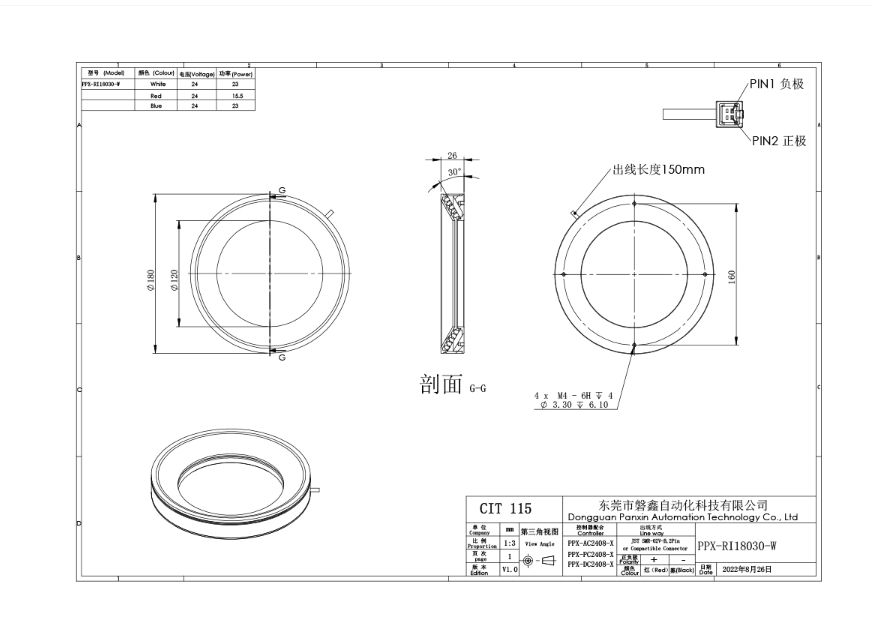 PPX 磐鑫 PPX-RI18030 环形光源 应用范围 通用外观检测/物体有无识别/PCB基板检测/字符识别/显微镜照明/塑胶容器检测 产品特点 不同角度设计360°环形照射无死角,突出产品三维信息。 高密度LED排列亮度高,照射均匀。 选配漫反射板,光线柔和均匀性更强。 光源电源线采用定制设计的出线卡扣提高光源抗拉扯,耐摇摆性能10倍以上。 技术指标 手机/微信:13682357734 电话:0755-84690029 QQ: 2844337877 邮箱:2844337877@qq.com...