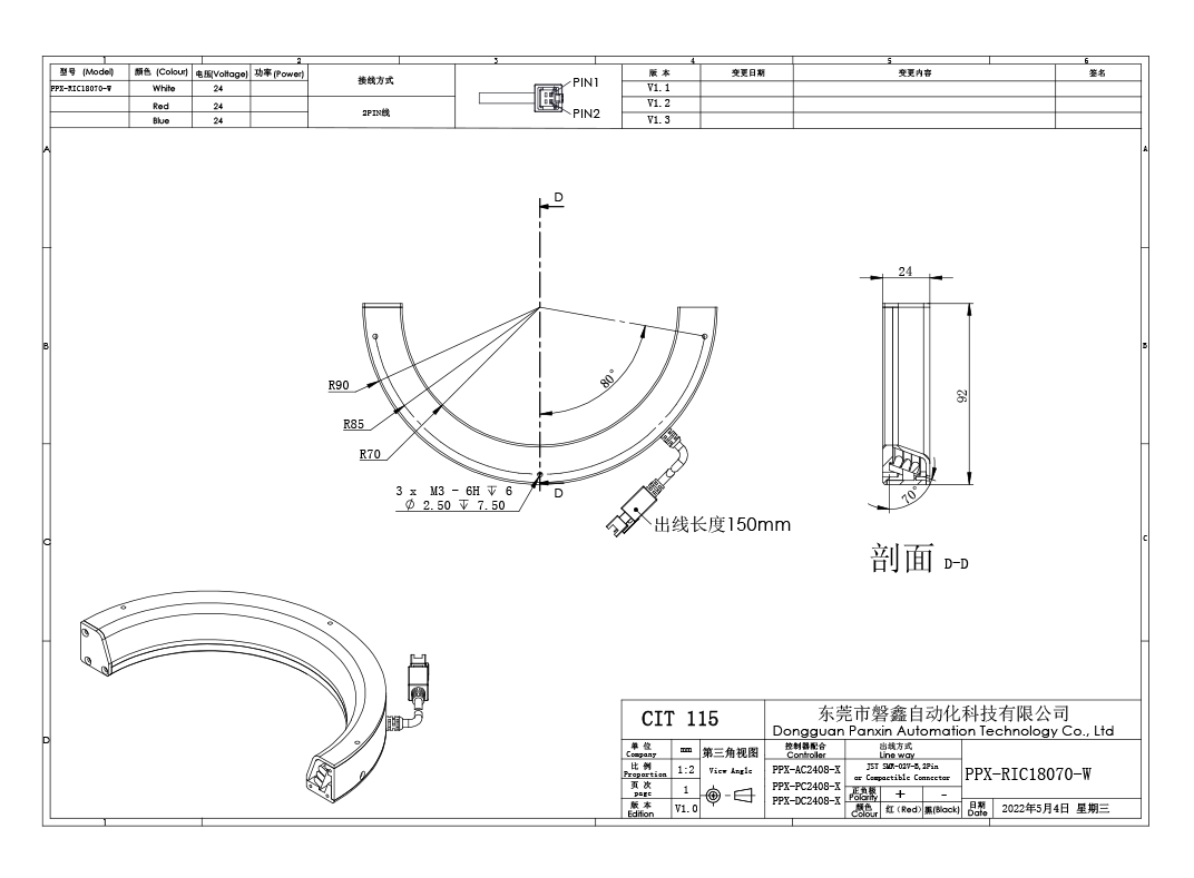 PPX 磐鑫 PPX-RIC18070-W 半圆形光源 应用范围 椭圆形边缘成像/有无筛选/MARK点定位/安装空间有限的场合/表面划伤 缺陷检测 产品特点 与条形光源组合应用形成椭圆形打光方式 特别针对弧形产品设计 具有非常均匀的成像效果 高密度LED排列 亮度高 照射均匀 选配漫反射板 光线柔和 均匀性更强 光源电源线采用定制设计的出线卡扣 提高光源抗拉扯 耐摇摆性能10倍以上 技术指标 手机/微信:13682357734 电话:0755-84690029 QQ: 2844337877 邮箱:2844337877@qq.com...