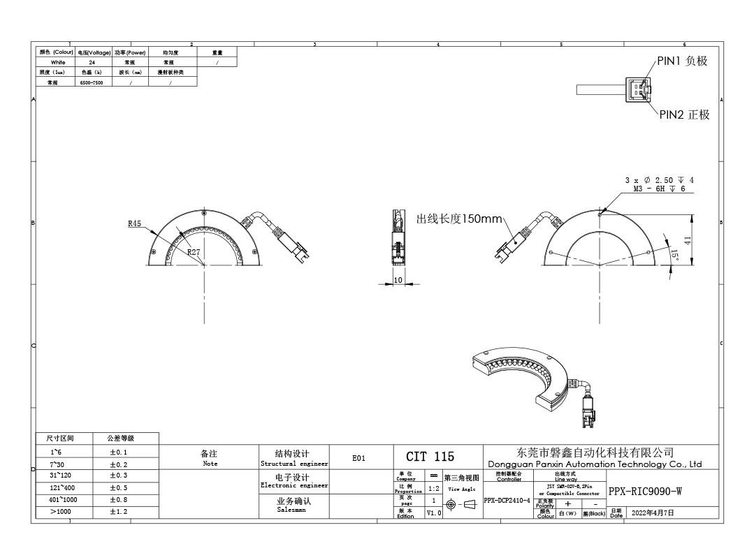 PPX 磐鑫 PPX-RIC9090-W 半圆形光源 应用范围 椭圆形边缘成像/有无筛选/MARK点定位/安装空间有限的场合/表面划伤 缺陷检测 产品特点 与条形光源组合应用形成椭圆形打光方式 特别针对弧形产品设计 具有非常均匀的成像效果 高密度LED排列 亮度高 照射均匀 选配漫反射板 光线柔和 均匀性更强 光源电源线采用定制设计的出线卡扣 提高光源抗拉扯 耐摇摆性能10倍以上 技术指标 手机/微信:13682357734 电话:0755-84690029 QQ: 2844337877 邮箱:2844337877@qq.com...