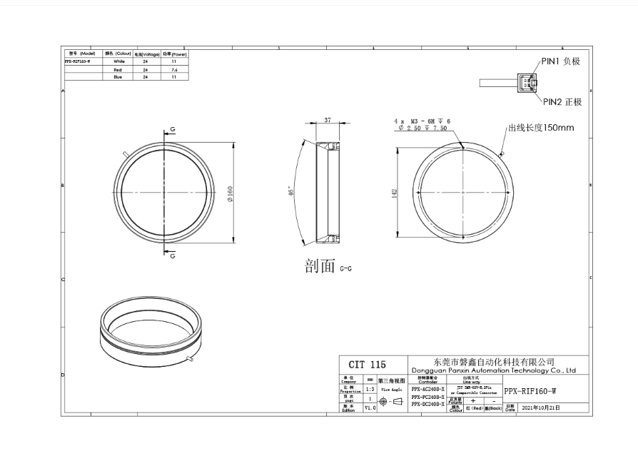 PPX 磐鑫 PPX-RIF160 环形无影光源 应用范围 反光物体表面检测/有无筛选/MARK点定位/二维码条形码读取识别/表面划伤,缺陷检测 产品特点 相较于普通的环形光源均 匀性大大提升 特制漫反射板光线均匀柔和实现了无影效果 高密度LED排列 亮度高 照射均匀 光源电源线采用定制设计的出线卡扣 提高光源抗拉扯耐摇摆性能10倍以上 技术指标 手机/微信:13682357734 电话:0755-84690029 QQ: 2844337877 邮箱:2844337877@qq.com...