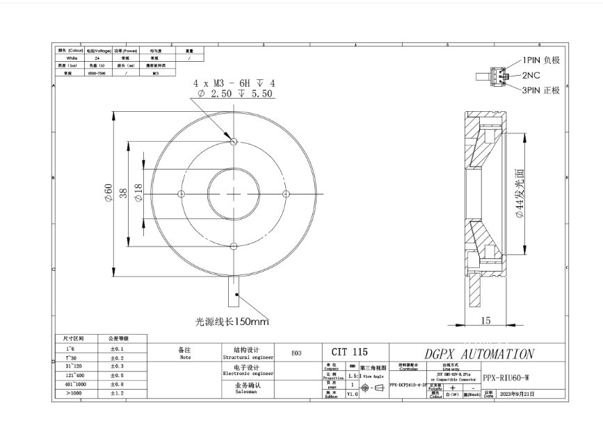 PPX 磐鑫 PPX-RIU60 环形无影光源 应用范围 反光物体表面检测/有无筛选/MARK点定位/二维码条形码读取识别/表面划伤,缺陷检测 产品特点 相较于普通的环形光源均 匀性大大提升 特制漫反射板光线均匀柔和实现了无影效果 高密度LED排列 亮度高 照射均匀 光源电源线采用定制设计的出线卡扣 提高光源抗拉扯耐摇摆性能10倍以上 技术指标 手机/微信:13682357734 电话:0755-84690029 QQ: 2844337877 邮箱:2844337877@qq.com...