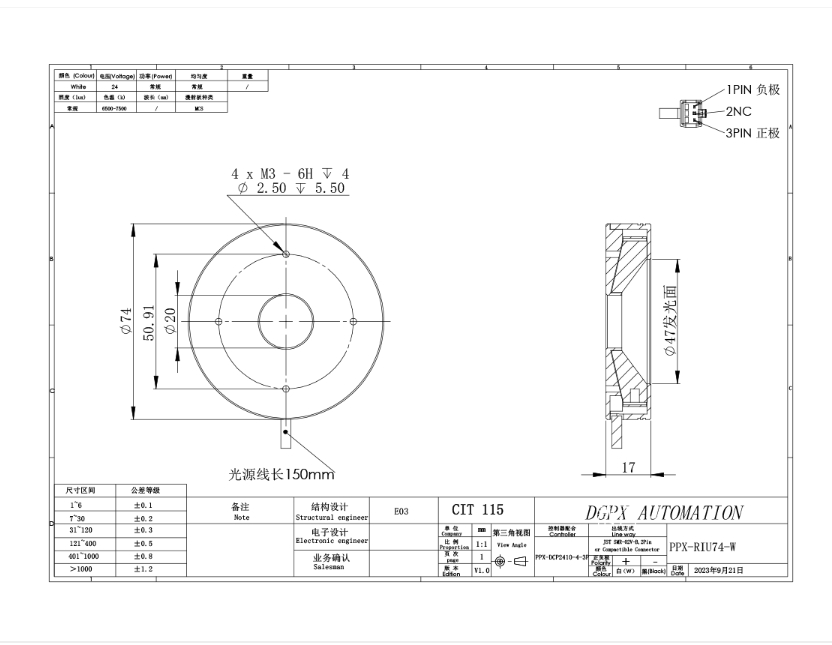 PPX 磐鑫 PPX-RIU74 环形无影光源 应用范围 反光物体表面检测/有无筛选/MARK点定位/二维码条形码读取识别/表面划伤,缺陷检测 产品特点 相较于普通的环形光源均 匀性大大提升 特制漫反射板光线均匀柔和实现了无影效果 高密度LED排列 亮度高 照射均匀 光源电源线采用定制设计的出线卡扣 提高光源抗拉扯耐摇摆性能10倍以上 技术指标 手机/微信:13682357734 电话:0755-84690029 QQ: 2844337877 邮箱:2844337877@qq.com...
