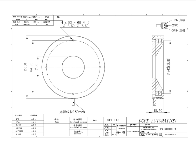 PPX 磐鑫 PPX-RIU100 环形无影光源 应用范围 反光物体表面检测/有无筛选/MARK点定位/二维码条形码读取识别/表面划伤,缺陷检测 产品特点 相较于普通的环形光源均 匀性大大提升 特制漫反射板光线均匀柔和实现了无影效果 高密度LED排列 亮度高 照射均匀 光源电源线采用定制设计的出线卡扣 提高光源抗拉扯耐摇摆性能10倍以上 技术指标 手机/微信:13682357734 电话:0755-84690029 QQ: 2844337877 邮箱:2844337877@qq.com...