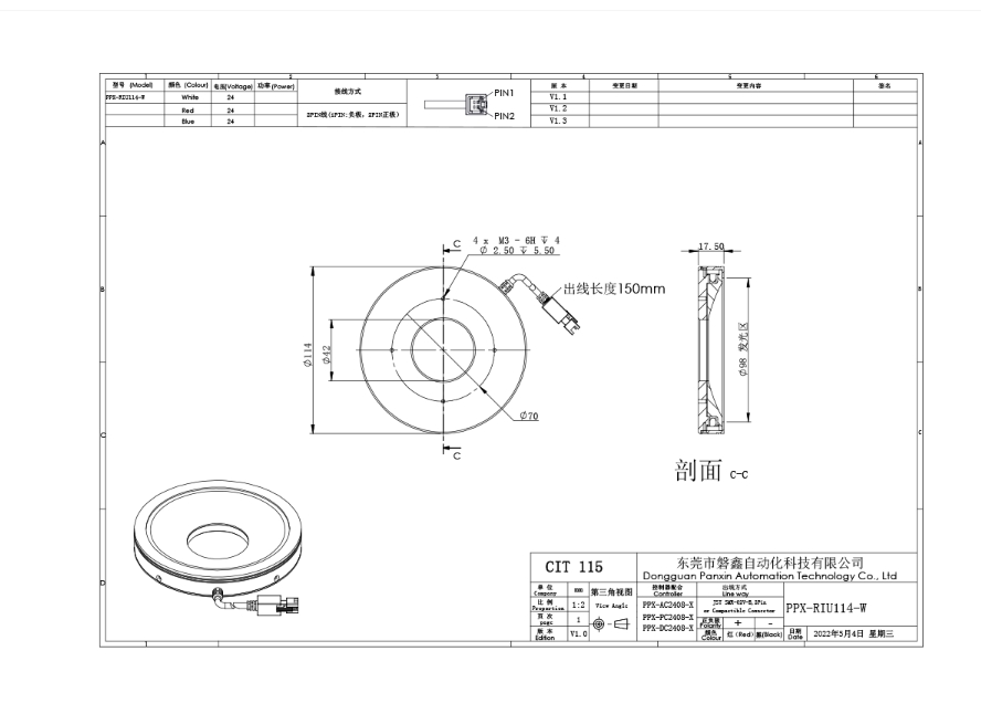 PPX 磐鑫 PPX-RIU114 环形无影光源 应用范围 反光物体表面检测/有无筛选/MARK点定位/二维码条形码读取识别/表面划伤,缺陷检测 产品特点 相较于普通的环形光源均 匀性大大提升 特制漫反射板光线均匀柔和实现了无影效果 高密度LED排列 亮度高 照射均匀 光源电源线采用定制设计的出线卡扣 提高光源抗拉扯耐摇摆性能10倍以上 技术指标 手机/微信:13682357734 电话:0755-84690029 QQ: 2844337877 邮箱:2844337877@qq.com...