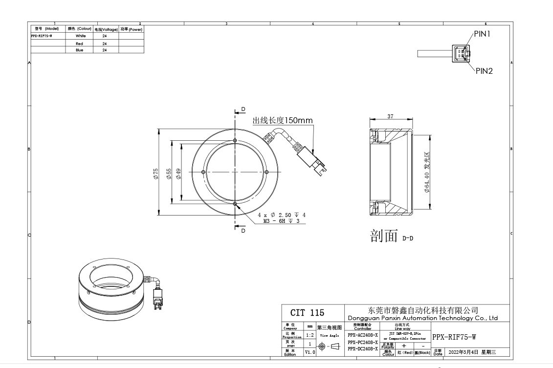 PPX 磐鑫 PPX-RIF75 环形无影光源 应用范围 反光物体表面检测/有无筛选/MARK点定位/二维码条形码读取识别/表面划伤,缺陷检测 产品特点 相较于普通的环形光源均 匀性大大提升 特制漫反射板光线均匀柔和实现了无影效果 高密度LED排列 亮度高 照射均匀 光源电源线采用定制设计的出线卡扣 提高光源抗拉扯耐摇摆性能10倍以上 01. 技术指标 手机/微信:13682357734 电话:0755-84690029 QQ: 2844337877 邮箱:2844337877@qq.com...