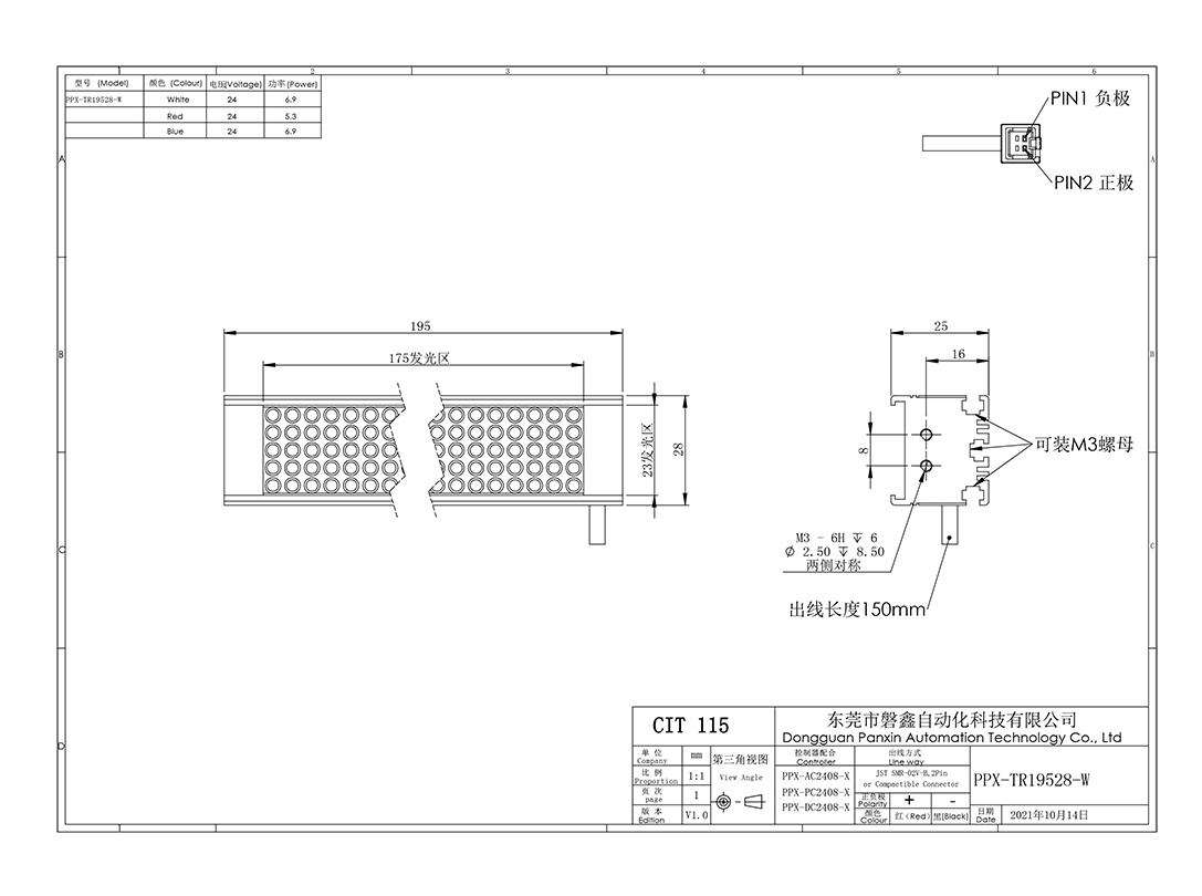 PPX 磐鑫 PPX-TR19528 条形光源 应用范围 较大物体表面检测/图像扫描/二维码识别/条形边缺陷检测 产品特点 产品尺寸跨度大发光长度从几十毫米到几千毫米均可制作大面积打光首选 高密度LED排列亮度高照射均匀 选配漫反射板,光线柔和均匀性更强 光源电源线采用定制设计的出线卡扣提高光源抗拉扯,耐摇摆性能10倍以上 照射角度自由灵活安装方式灵活 技术指标 手机/微信:13682357734 电话:0755-84690029 QQ: 2844337877 邮箱:2844337877@qq.com...