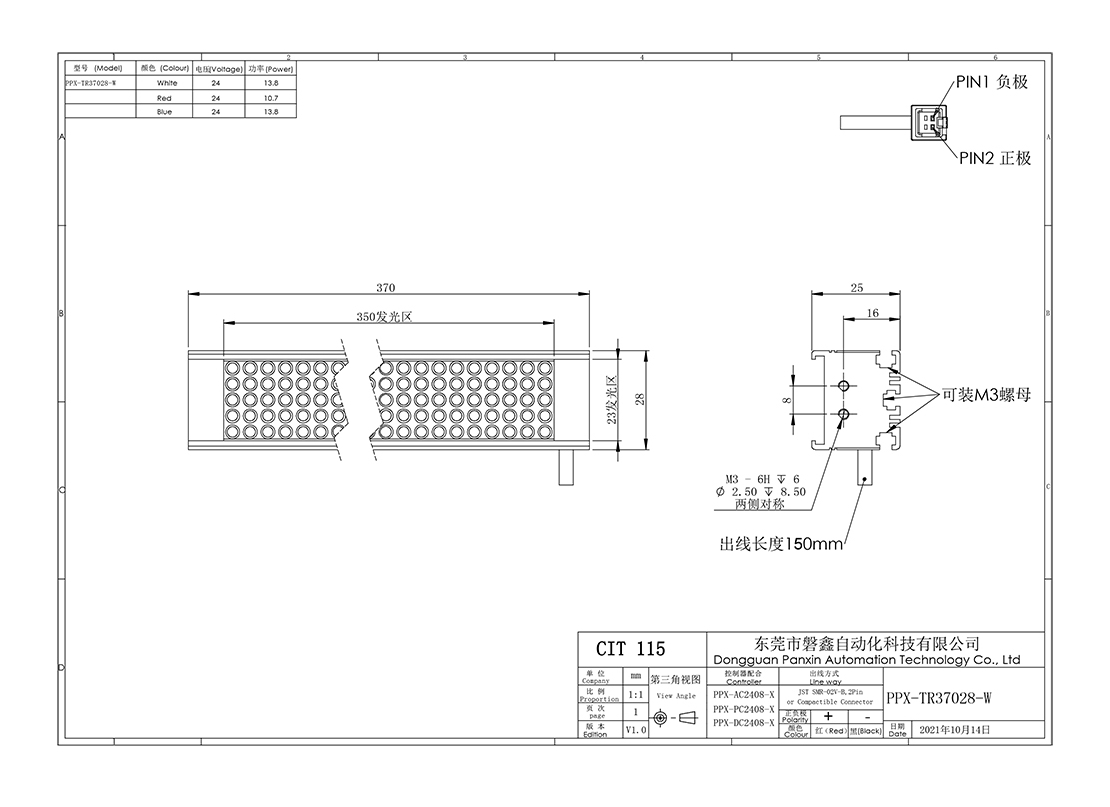PPX 磐鑫 PPX-TR37028 条形光源 应用范围 较大物体表面检测/图像扫描/二维码识别/条形边缺陷检测 产品特点 产品尺寸跨度大发光长度从几十毫米到几千毫米均可制作大面积打光首选 高密度LED排列亮度高照射均匀 选配漫反射板,光线柔和均匀性更强 光源电源线采用定制设计的出线卡扣提高光源抗拉扯,耐摇摆性能10倍以上 照射角度自由灵活安装方式灵活 01. 技术指标 手机/微信:13682357734 电话:0755-84690029 QQ: 2844337877 邮箱:2844337877@qq.com...