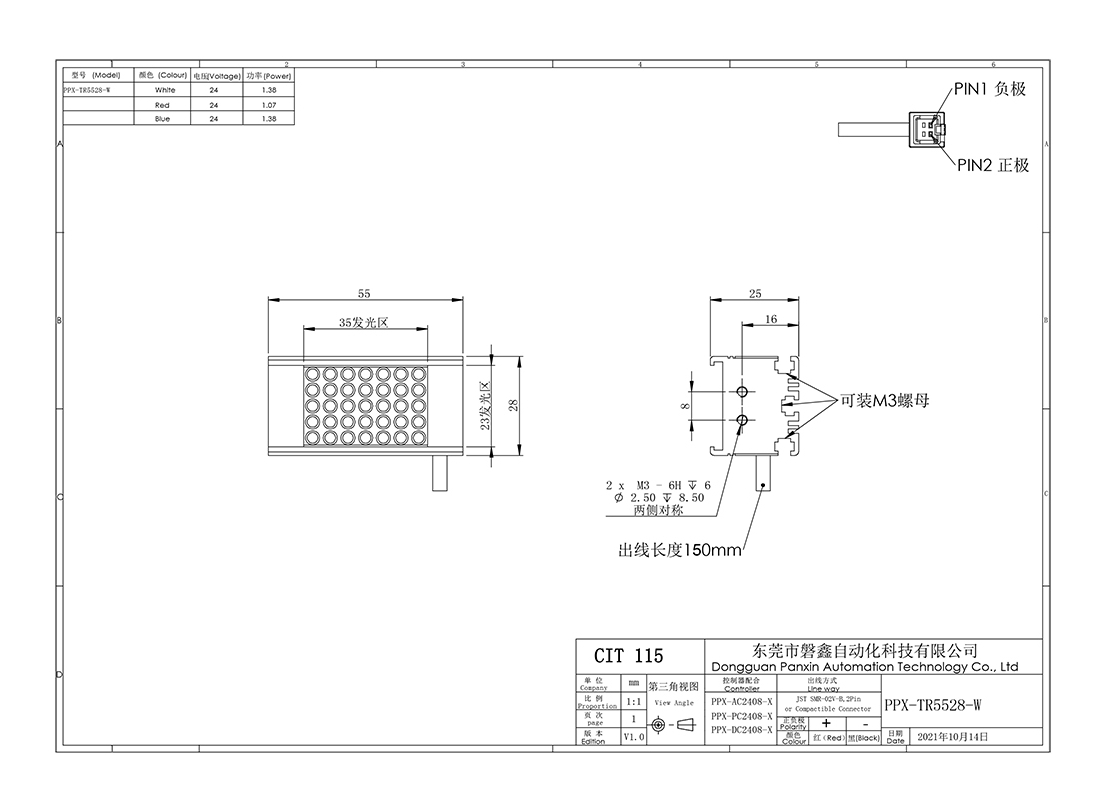 PPX 磐鑫 PPX-TR5528 条形光源 应用范围 较大物体表面检测/图像扫描/二维码识别/条形边缺陷检测 产品特点 产品尺寸跨度大发光长度从几十毫米到几千毫米均可制作大面积打光首选 高密度LED排列亮度高照射均匀 选配漫反射板,光线柔和均匀性更强 光源电源线采用定制设计的出线卡扣提高光源抗拉扯,耐摇摆性能10倍以上 照射角度自由灵活安装方式灵活 技术指标 手机/微信:13682357734 电话:0755-84690029 QQ: 2844337877 邮箱:2844337877@qq.com...