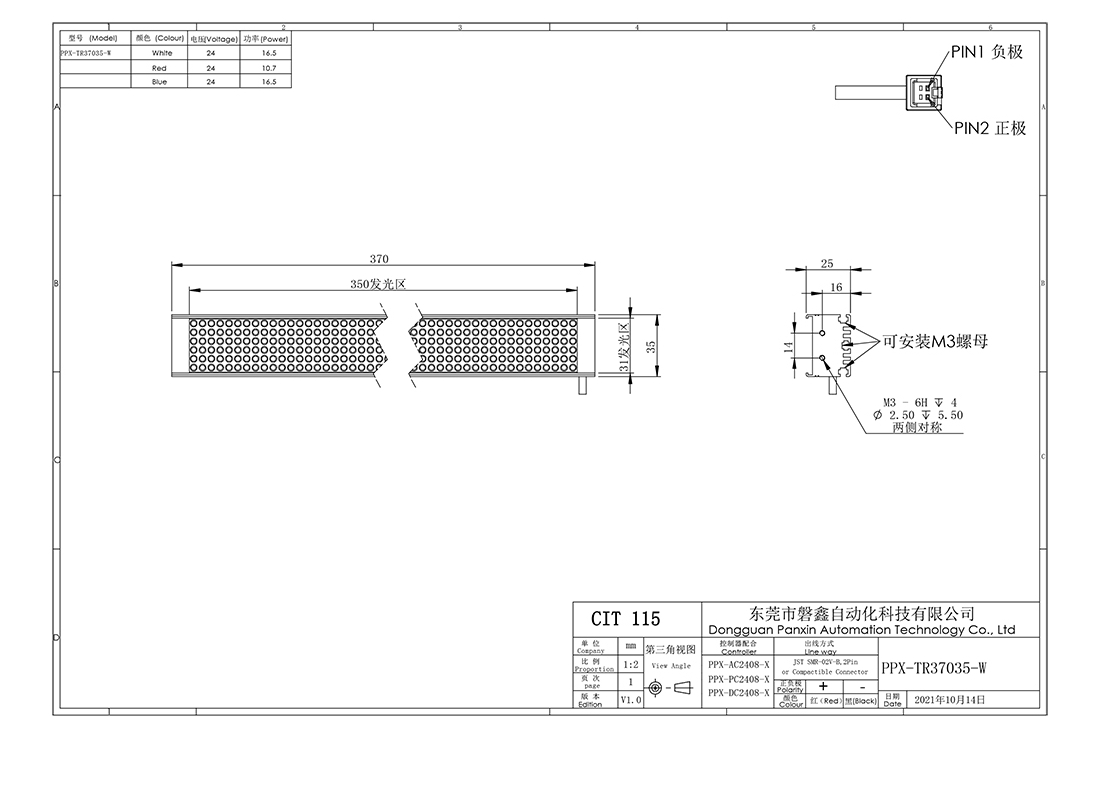 PPX 磐鑫 PPX-TR37035 条形光源 应用范围 较大物体表面检测/图像扫描/二维码识别/条形边缺陷检测 产品特点 产品尺寸跨度大发光长度从几十毫米到几千毫米均可制作大面积打光首选 高密度LED排列亮度高照射均匀 选配漫反射板,光线柔和均匀性更强 光源电源线采用定制设计的出线卡扣提高光源抗拉扯,耐摇摆性能10倍以上 照射角度自由灵活安装方式灵活 01. 技术指标 手机/微信:13682357734 电话:0755-84690029 QQ: 2844337877 邮箱:2844337877@qq.com...