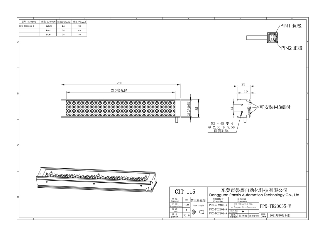 PPX 磐鑫 PPX-TR23035 条形光源 应用范围 较大物体表面检测/图像扫描/二维码识别/条形边缺陷检测 产品特点 产品尺寸跨度大发光长度从几十毫米到几千毫米均可制作大面积打光首选 高密度LED排列亮度高照射均匀 选配漫反射板,光线柔和均匀性更强 光源电源线采用定制设计的出线卡扣提高光源抗拉扯,耐摇摆性能10倍以上 照射角度自由灵活安装方式灵活 01. 技术指标 手机/微信:13682357734 电话:0755-84690029 QQ: 2844337877 邮箱:2844337877@qq.com...