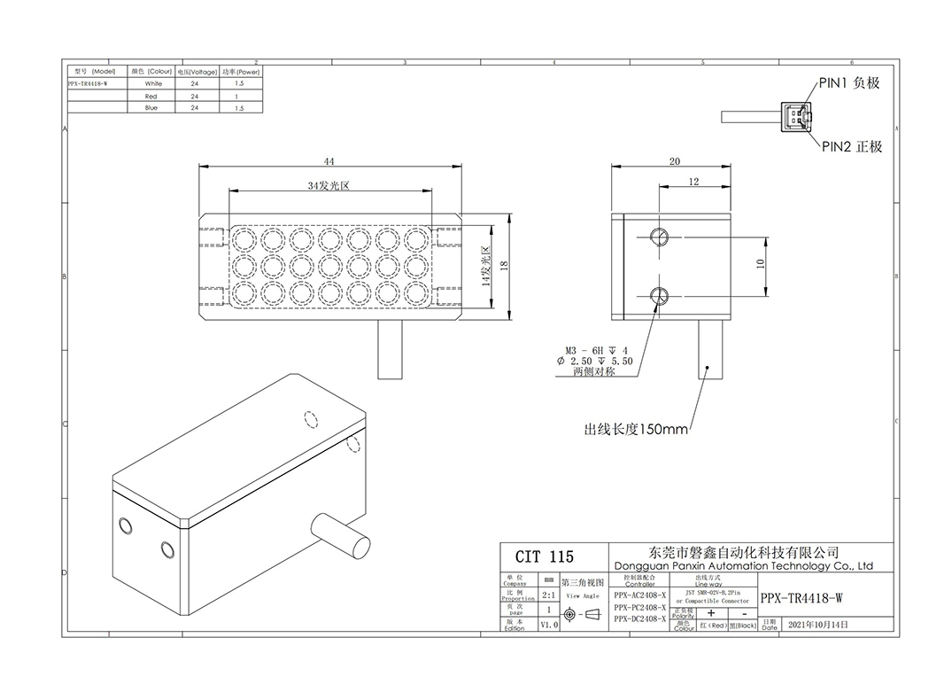PPX 磐鑫 PPX-TR4418 条形光源 应用范围 较大物体表面检测/图像扫描/二维码识别/条形边缺陷检测 产品特点 产品尺寸跨度大发光长度从几十毫米到几千毫米均可制作大面积打光首选 高密度LED排列亮度高照射均匀 选配漫反射板,光线柔和均匀性更强 光源电源线采用定制设计的出线卡扣提高光源抗拉扯,耐摇摆性能10倍以上 照射角度自由灵活安装方式灵活 01. 技术指标 手机/微信:13682357734 电话:0755-84690029 QQ: 2844337877 邮箱:2844337877@qq.com...