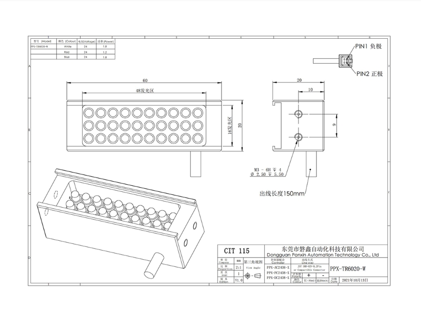 PPX 磐鑫 PPX-TR6020 条形光源 应用范围 较大物体表面检测/图像扫描/二维码识别/条形边缺陷检测 产品特点 产品尺寸跨度大发光长度从几十毫米到几千毫米均可制作大面积打光首选 高密度LED排列亮度高照射均匀 选配漫反射板,光线柔和均匀性更强 光源电源线采用定制设计的出线卡扣提高光源抗拉扯,耐摇摆性能10倍以上 照射角度自由灵活安装方式灵活 01. 技术指标 手机/微信:13682357734 电话:0755-84690029 QQ: 2844337877 邮箱:2844337877@qq.com...