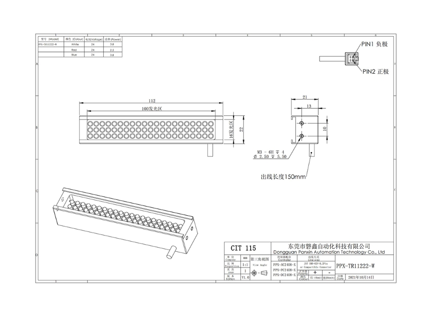 PPX 磐鑫 PPX-TR11222 条形光源 应用范围 较大物体表面检测/图像扫描/二维码识别/条形边缺陷检测 产品特点 产品尺寸跨度大发光长度从几十毫米到几千毫米均可制作大面积打光首选 高密度LED排列亮度高照射均匀 选配漫反射板,光线柔和均匀性更强 光源电源线采用定制设计的出线卡扣提高光源抗拉扯,耐摇摆性能10倍以上 照射角度自由灵活安装方式灵活 01. 技术指标 手机/微信:13682357734 电话:0755-84690029 QQ: 2844337877 邮箱:2844337877@qq.com...