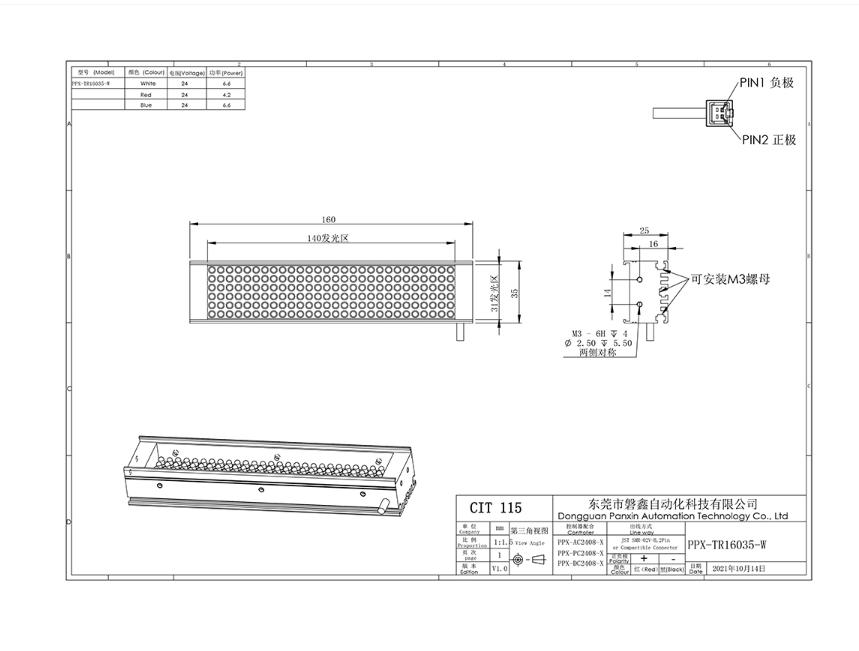 PPX 磐鑫 PPX-TR16035 条形光源 应用范围 较大物体表面检测/图像扫描/二维码识别/条形边缺陷检测 产品特点 产品尺寸跨度大发光长度从几十毫米到几千毫米均可制作大面积打光首选 高密度LED排列亮度高照射均匀 选配漫反射板,光线柔和均匀性更强 光源电源线采用定制设计的出线卡扣提高光源抗拉扯,耐摇摆性能10倍以上 照射角度自由灵活安装方式灵活 01. 技术指标 手机/微信:13682357734 电话:0755-84690029 QQ: 2844337877 邮箱:2844337877@qq.com...