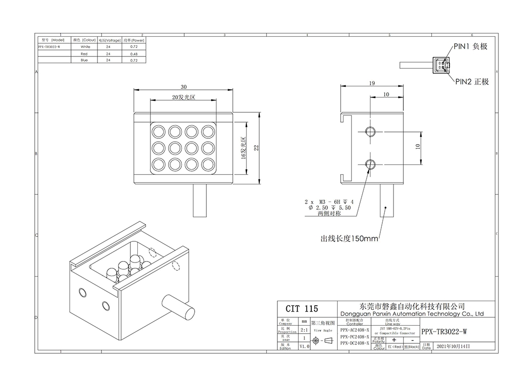 PPX 磐鑫 PPX-TR3022 条形光源 应用范围 较大物体表面检测/图像扫描/二维码识别/条形边缺陷检测 产品特点 产品尺寸跨度大发光长度从几十毫米到几千毫米均可制作大面积打光首选 高密度LED排列亮度高照射均匀 选配漫反射板,光线柔和均匀性更强 光源电源线采用定制设计的出线卡扣提高光源抗拉扯,耐摇摆性能10倍以上 照射角度自由灵活安装方式灵活 01. 技术指标 手机/微信:13682357734 电话:0755-84690029 QQ: 2844337877 邮箱:2844337877@qq.com...