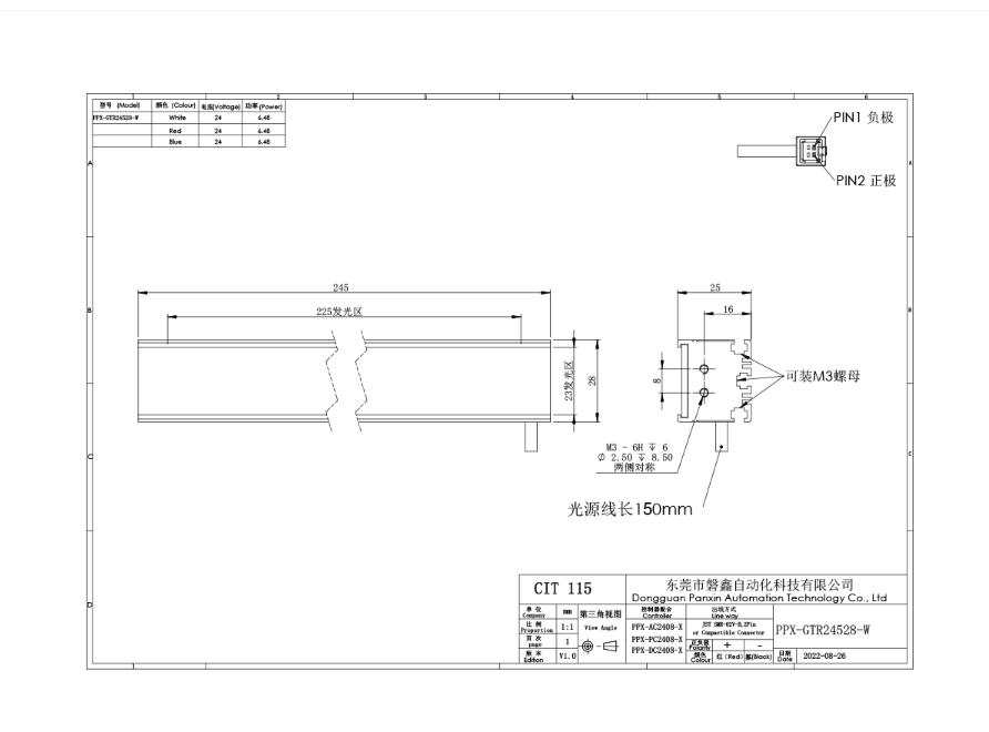 PPX 磐鑫 PPX-GTR24528-W 高均匀条形光源 应用范围 反光面外观检测/可做长条形背光使用/大面积轮廓定位检测/覆膜包装检测定位 产品特点 最长可做2000mm 模块化设计 定制时间短 高均匀长条形设计 可做背光使用 高密度贴片LED排列 亮度高 照射均匀 两侧及底部做凸型槽设计 安装灵活 适宜多种场合 光源电源线采用定制设计的出线卡扣 提高光源抗拉扯耐摇摆性能10倍以上 01. 技术指标 手机/微信:13682357734 电话:0755-84690029 QQ: 2844337877 邮箱:2844337877@qq.com...