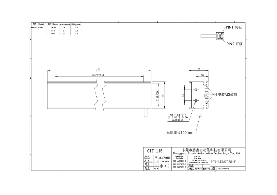 PPX 磐鑫 PPX-GTR27035-W 高均匀条形光源 应用范围 反光面外观检测/可做长条形背光使用/大面积轮廓定位检测/覆膜包装检测定位 产品特点 最长可做2000mm 模块化设计 定制时间短 高均匀长条形设计 可做背光使用 高密度贴片LED排列 亮度高 照射均匀 两侧及底部做凸型槽设计 安装灵活 适宜多种场合 光源电源线采用定制设计的出线卡扣 提高光源抗拉扯耐摇摆性能10倍以上 01. 技术指标 手机/微信:13682357734 电话:0755-84690029 QQ: 2844337877 邮箱:2844337877@qq.com...