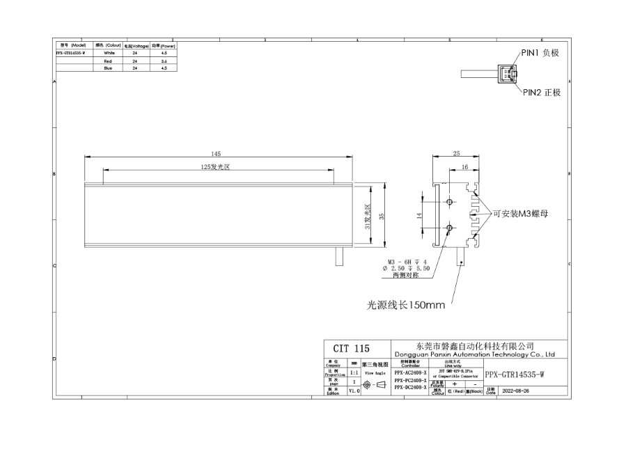 PPX 磐鑫 PPX-GTR14535-W 高均匀条形光源 应用范围 反光面外观检测/可做长条形背光使用/大面积轮廓定位检测/覆膜包装检测定位 产品特点 最长可做2000mm 模块化设计 定制时间短 高均匀长条形设计 可做背光使用 高密度贴片LED排列 亮度高 照射均匀 两侧及底部做凸型槽设计 安装灵活 适宜多种场合 光源电源线采用定制设计的出线卡扣 提高光源抗拉扯耐摇摆性能10倍以上 01. 技术指标 手机/微信:13682357734 电话:0755-84690029 QQ: 2844337877 邮箱:2844337877@qq.com...