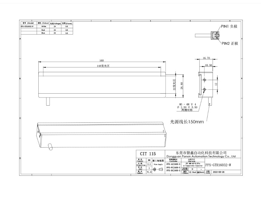 PPX 磐鑫 PPX-GTR16032-W 高均匀条形光源 应用范围 反光面外观检测/可做长条形背光使用/大面积轮廓定位检测/覆膜包装检测定位 产品特点 最长可做2000mm 模块化设计 定制时间短 高均匀长条形设计 可做背光使用 高密度贴片LED排列 亮度高 照射均匀 两侧及底部做凸型槽设计 安装灵活 适宜多种场合 光源电源线采用定制设计的出线卡扣 提高光源抗拉扯耐摇摆性能10倍以上 01. 技术指标 手机/微信:13682357734 电话:0755-84690029 QQ: 2844337877 邮箱:2844337877@qq.com...