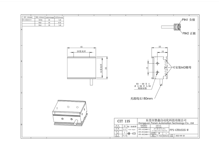 PPX 磐鑫 PPX-GTR4535-W 高均匀条形光源 应用范围 反光面外观检测/可做长条形背光使用/大面积轮廓定位检测/覆膜包装检测定位 产品特点 最长可做2000mm 模块化设计 定制时间短 高均匀长条形设计 可做背光使用 高密度贴片LED排列 亮度高 照射均匀 两侧及底部做凸型槽设计 安装灵活 适宜多种场合 光源电源线采用定制设计的出线卡扣 提高光源抗拉扯耐摇摆性能10倍以上 01. 技术指标 手机/微信:13682357734 电话:0755-84690029 QQ: 2844337877 邮箱:2844337877@qq.com...