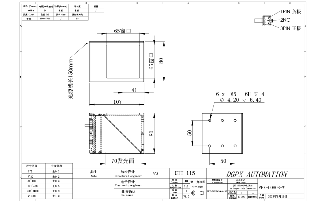PPX 磐鑫 PPX-CO80S 同轴光源 应用范围 反光表面检测/有无筛选/MARK点定位/液晶显示屏定位检测/表面划伤,缺陷检测 产品特点 采用国际一流镀膜分光镜 成像品质高 无重影 采用同轴光源专用散热部件 保证光源散热效率 最大限度延长使用周期 高密度LED排列 亮度高 照射均匀 选配漫反射板 光线柔和 均匀性更强 光源电源线采用定制设计的出线卡扣 提高光源抗拉扯 耐摇摆性能10倍以上 01. 技术指标 手机/微信:13682357734 电话:0755-84690029 QQ: 2844337877 邮箱:2844337877@qq.com...