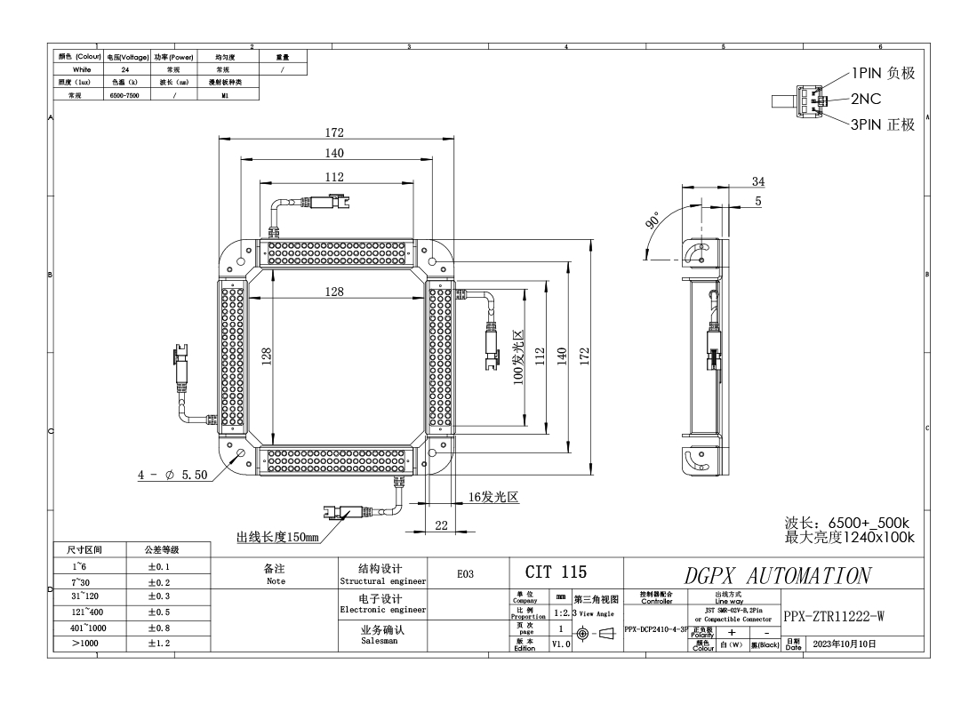 PPX 磐鑫 PPX-ZTR11222 组合条形光源 应用范围 外观检测/有无筛选/大面积轮廓检测/异性插件焊脚定位/显微镜照明/流水线条码扫描 产品特点 由条光组合而成 光源照射角度可以自由调节 可单独控制亮度 大面积表面 轮廓打光首选 高密度LED排列 亮度高 照射均匀 选配漫反射板 光线柔和 均匀性更强 光源电源线采用定制设计的出线卡扣 提高光源抗拉伸 耐摇摆性能10倍以上 01. 技术指标 手机/微信:13682357734 电话:0755-84690029 QQ: 2844337877 邮箱:2844337877@qq.com...