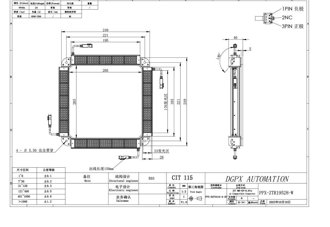 PPX 磐鑫 PPX-ZTR19528 组合条形光源 应用范围 外观检测/有无筛选/大面积轮廓检测/异性插件焊脚定位/显微镜照明/流水线条码扫描 产品特点 由条光组合而成 光源照射角度可以自由调节 可单独控制亮度 大面积表面 轮廓打光首选 高密度LED排列 亮度高 照射均匀 选配漫反射板 光线柔和 均匀性更强 光源电源线采用定制设计的出线卡扣 提高光源抗拉伸 耐摇摆性能10倍以上 01. 技术指标 手机/微信:13682357734 电话:0755-84690029 QQ: 2844337877 邮箱:2844337877@qq.com...
