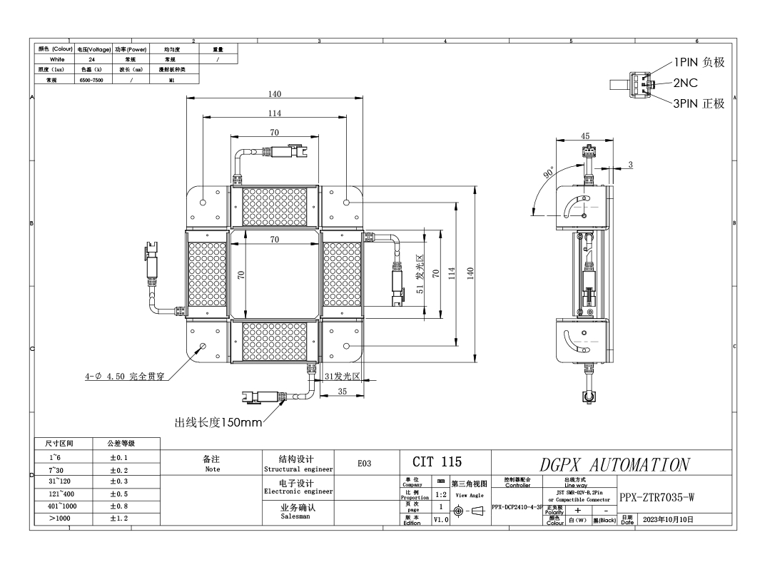 PPX 磐鑫 PPX-ZTR7035 组合条形光源 应用范围 外观检测/有无筛选/大面积轮廓检测/异性插件焊脚定位/显微镜照明/流水线条码扫描 产品特点 由条光组合而成 光源照射角度可以自由调节 可单独控制亮度 大面积表面 轮廓打光首选 高密度LED排列 亮度高 照射均匀 选配漫反射板 光线柔和 均匀性更强 光源电源线采用定制设计的出线卡扣 提高光源抗拉伸 耐摇摆性能10倍以上 01. 技术指标 手机/微信:13682357734 电话:0755-84690029 QQ: 2844337877 邮箱:2844337877@qq.com...
