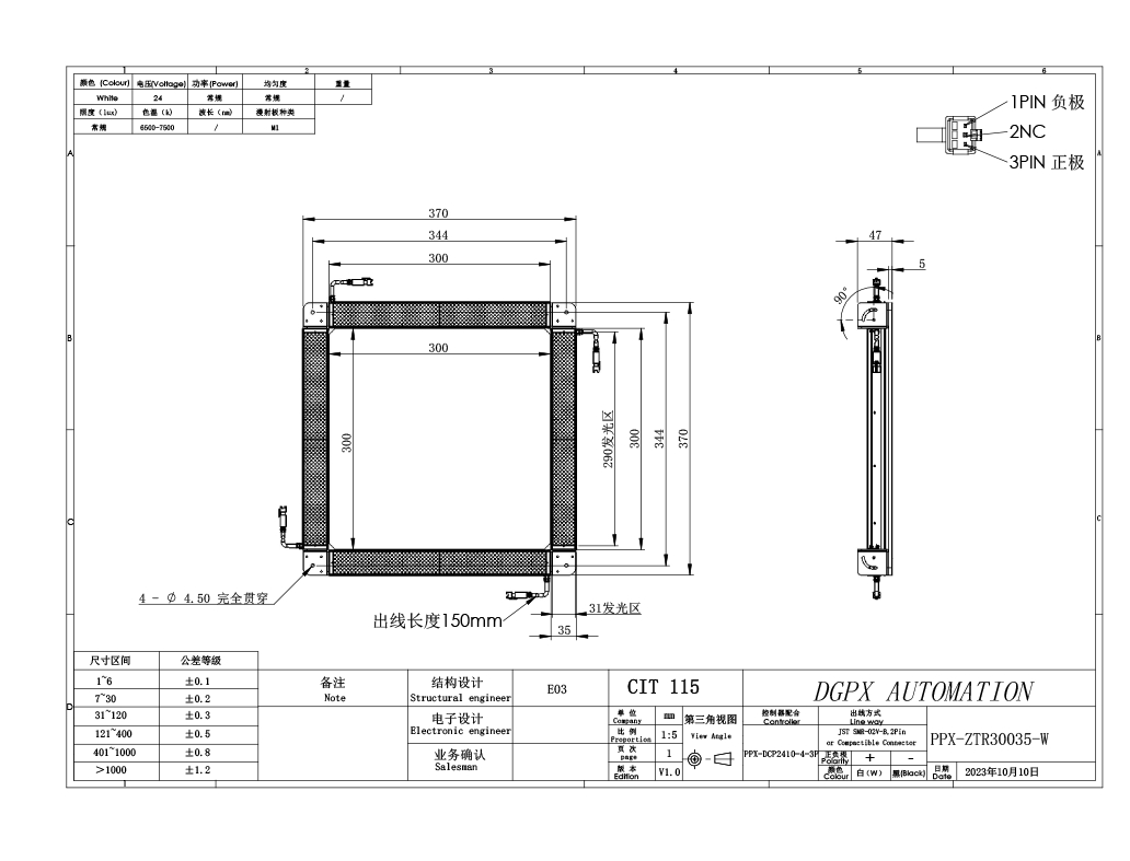 PPX 磐鑫 PPX-ZTR30035 组合条形光源 应用范围 外观检测/有无筛选/大面积轮廓检测/异性插件焊脚定位/显微镜照明/流水线条码扫描 产品特点 由条光组合而成 光源照射角度可以自由调节 可单独控制亮度 大面积表面 轮廓打光首选 高密度LED排列 亮度高 照射均匀 选配漫反射板 光线柔和 均匀性更强 光源电源线采用定制设计的出线卡扣 提高光源抗拉伸 耐摇摆性能10倍以上 01. 技术指标 手机/微信:13682357734 电话:0755-84690029 QQ: 2844337877 邮箱:2844337877@qq.com...