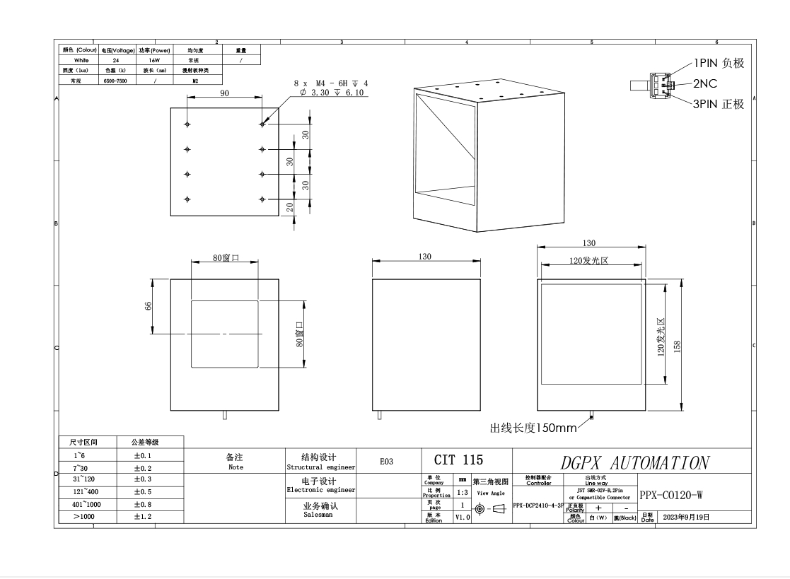 PPX 磐鑫 PPX-CO120 同轴光源 应用范围 反光表面检测/有无筛选/MARK点定位/液晶显示屏定位检测/表面划伤,缺陷检测 产品特点 采用国际一流镀膜分光镜 成像品质高 无重影 采用同轴光源专用散热部件 保证光源散热效率 最大限度延长使用周期 高密度LED排列 亮度高 照射均匀 选配漫反射板 光线柔和 均匀性更强 光源电源线采用定制设计的出线卡扣 提高光源抗拉扯 耐摇摆性能10倍以上 01. 技术指标 手机/微信:13682357734 电话:0755-84690029 QQ: 2844337877 邮箱:2844337877@qq.com...