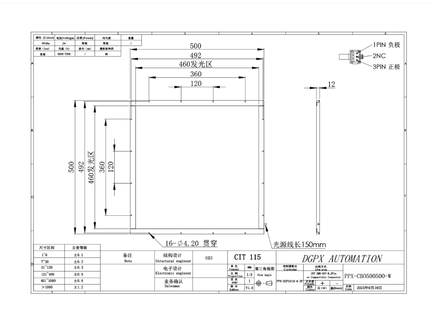 PPX 磐鑫 PPX-CBO500500-W 侧部背光源 应用范围 大面积产品检测与测量/大面积产品轮廓定位/显示屏坏点检测 产品特点 采用特殊漫射板 四面进光 均匀度可达95%以上 可实现最薄6mm的超薄设计 节省较大安装空间 亮度相对底部背光源稍低 对亮度要求高的客户谨慎选用 尺寸定制性强 大面积均匀照明首选 光源电源线采用定制设计的出线卡扣 光源抗拉扯 耐摇摆性能提高10倍以上 技术指标 手机/微信:13682357734 电话:0755-84690029 QQ: 2844337877 邮箱:2844337877@qq.com...