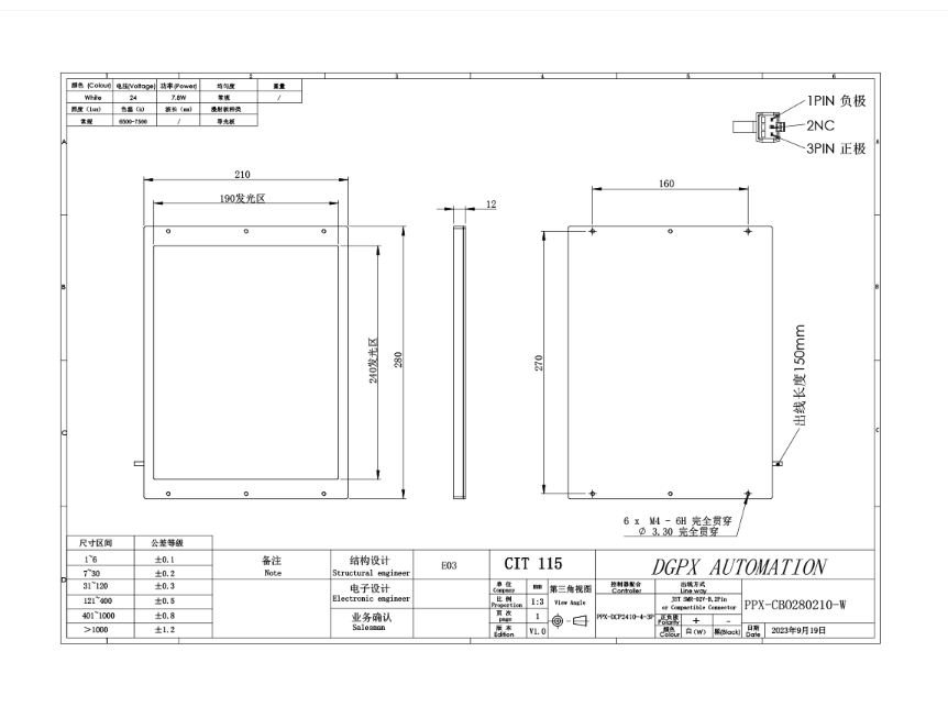 PPX 磐鑫 PPX-CBO280210-W 侧部背光源 应用范围 大面积产品检测与测量/大面积产品轮廓定位/显示屏坏点检测 产品特点 采用特殊漫射板 四面进光 均匀度可达95%以上 可实现最薄6mm的超薄设计 节省较大安装空间 亮度相对底部背光源稍低 对亮度要求高的客户谨慎选用 尺寸定制性强 大面积均匀照明首选 光源电源线采用定制设计的出线卡扣 光源抗拉扯 耐摇摆性能提高10倍以上 技术指标 手机/微信:13682357734 电话:0755-84690029 QQ: 2844337877 邮箱:2844337877@qq.com...
