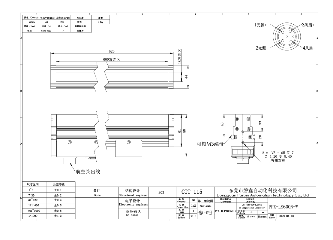 PPX 磐鑫 PPX-LS600N-W 线光源 应用范围 线阵系统专用光源/大面积产品表面检测/飞拍系统专用 产品特点 采用进口超大功率LED灯珠 光源亮度超高 采用超密扇热片加风扇 最大限度提高光源寿命 特殊设计的聚光柱,高效聚光 01. 技术指标 手机/微信:13682357734 电话:0755-84690029 QQ: 2844337877 邮箱:2844337877@qq.com...
