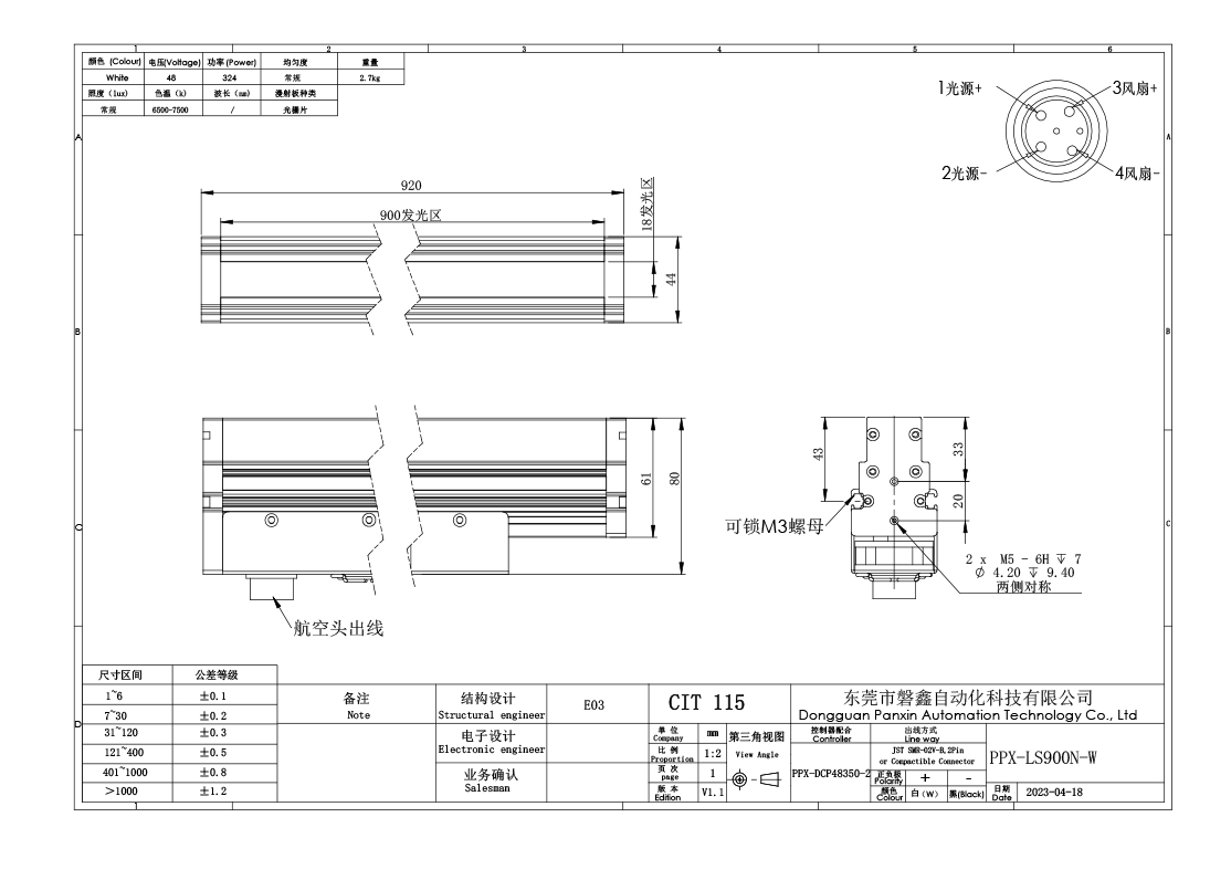PPX 磐鑫 PPX-LS900N-W 线光源 应用范围 线阵系统专用光源/大面积产品表面检测/飞拍系统专用 产品特点 采用进口超大功率LED灯珠 光源亮度超高 采用超密扇热片加风扇 最大限度提高光源寿命 特殊设计的聚光柱,高效聚光 01. 技术指标 手机/微信:13682357734 电话:0755-84690029 QQ: 2844337877 邮箱:2844337877@qq.com...