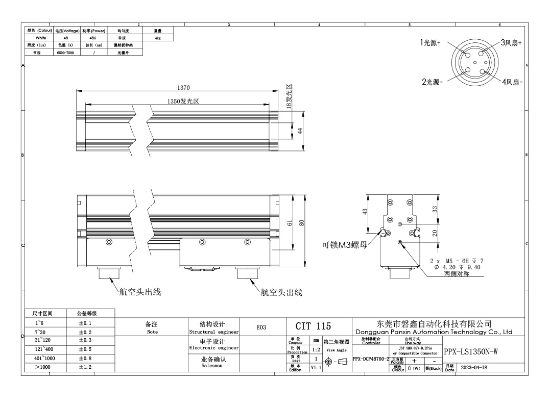 PPX 磐鑫 PPX-LS1350N-W 线光源 应用范围 线阵系统专用光源/大面积产品表面检测/飞拍系统专用 产品特点 采用进口超大功率LED灯珠 光源亮度超高 采用超密扇热片加风扇 最大限度提高光源寿命 特殊设计的聚光柱,高效聚光 01. 技术指标 手机/微信:13682357734 电话:0755-84690029 QQ: 2844337877 邮箱:2844337877@qq.com...