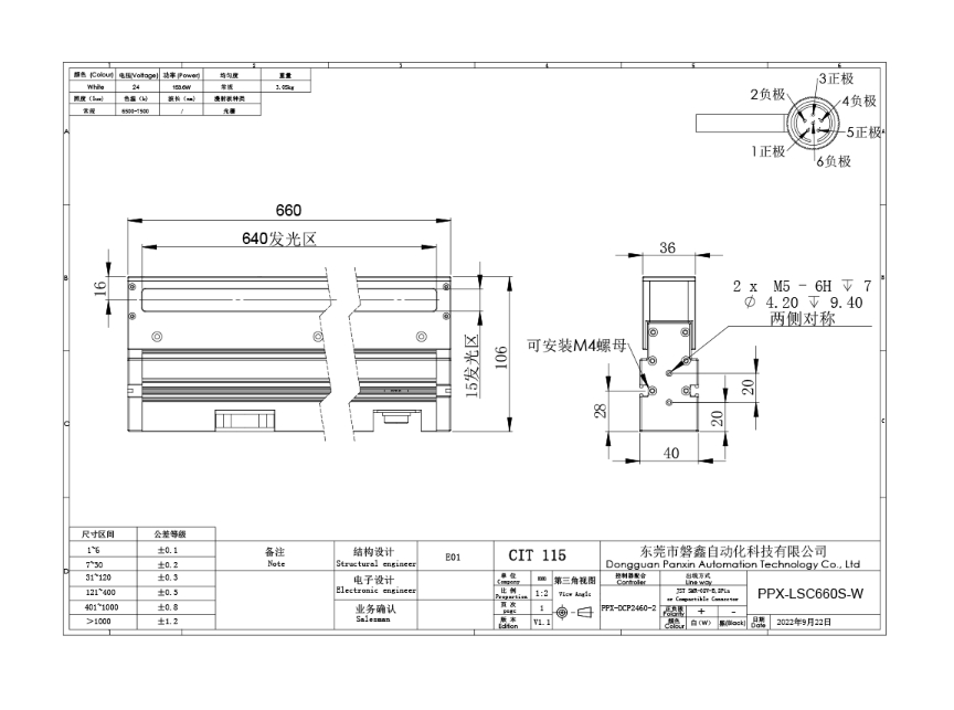 PPX 磐鑫 PPX-LSC660S-W 线扫同轴光源 应用范围 PCB基板检测/FPC检测/晶片检测/金手指检测 产品特点 模块化设计,同轴模块与线光源本体可灵活拆卸 铝合金一体成型外壳,散热好 上下面有螺母槽,安装灵活 光源电源线采用定制设计的出线卡扣提高光源抗拉扯 耐摇摆性能10倍以上 01. 技术指标 手机/微信:13682357734 电话:0755-84690029 QQ: 2844337877 邮箱:2844337877@qq.com...