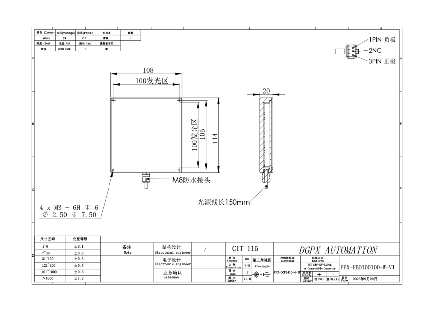 PPX 磐鑫 PPX-FBO100100 防水光源 应用范围 CNC铣床定位/油污 多尘环境/浅水层打光应用/室外应用 产品特点 PPX系列防水光源可达防水IP67标准 特殊机械结构设计 保证光源稳定 特别加大的散热片设计 保证在密封 多尘 油污环境下能呈现良好的工作状态 出线口采用定制金属防水接头 防水性能高 耐拉扯 01. 技术指标 手机/微信:13682357734 电话:0755-84690029 QQ: 2844337877 邮箱:2844337877@qq.com...