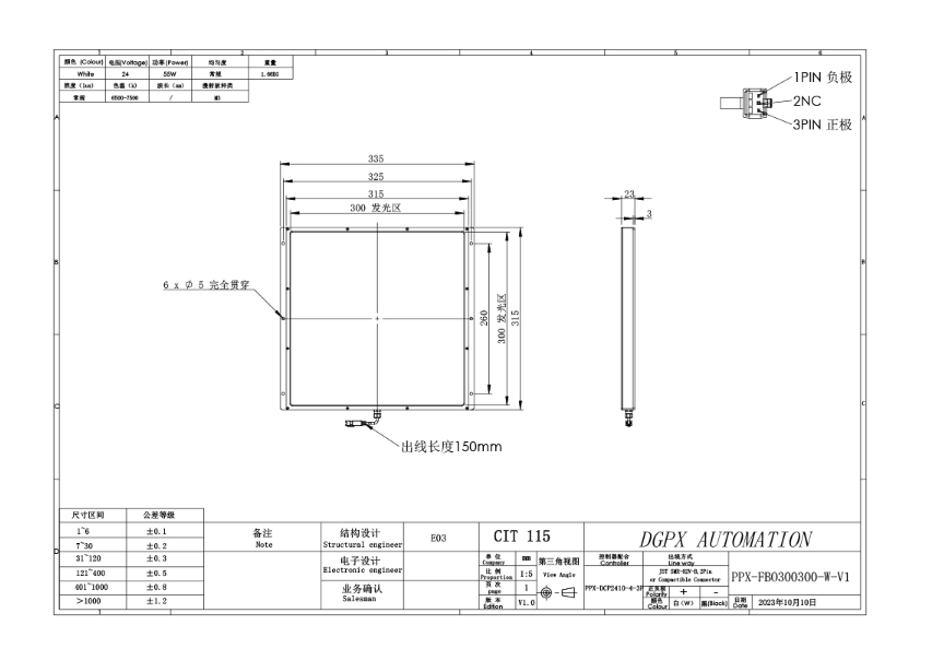 PPX 磐鑫 PPX-FBO300300 防水光源 应用范围 CNC铣床定位/油污 多尘环境/浅水层打光应用/室外应用 产品特点 PPX系列防水光源可达防水IP67标准 特殊机械结构设计 保证光源稳定 特别加大的散热片设计 保证在密封 多尘 油污环境下能呈现良好的工作状态 出线口采用定制金属防水接头 防水性能高 耐拉扯 01. 技术指标 手机/微信:13682357734 电话:0755-84690029 QQ: 2844337877 邮箱:2844337877@qq.com...