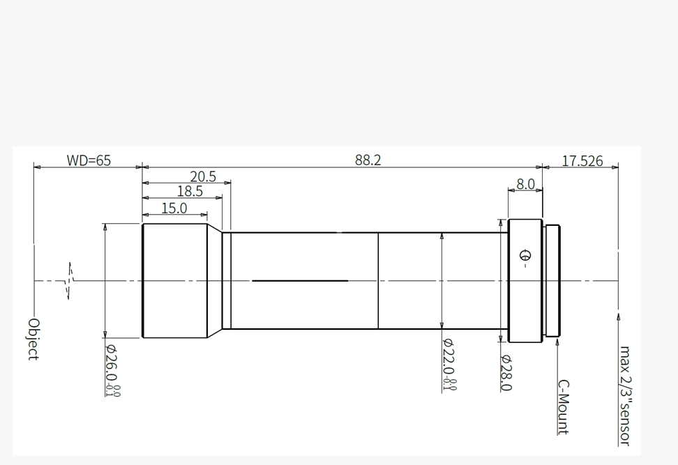 COOLENS 视清 WWH20-65ATV2 远心镜头 基本参数 支持CCD尺寸(Φmm) 11.0(2/3") 放大倍率β(x) 2 物方工作距WD(mm) 65±1 像方F/# 13.2 物方景深DOF(mm) 0.3 像方畸变(% max) <0.05 物方远心度(° max) <0.03 镜头总长(mm) 88.2 镜头接口 C 物方分辨率(μm) 4.4 数值孔径 NA 0.07554 是否同轴光 否 可变光栏 无 视野范围 (mmxmm) 1/2" (6.4x4.8) 3.2x2.4 1/1.8" (7.13x5.37) 3.6x2.7 2/3" (8.8x6.6) 4.4x3.3 手机/微信:13682357734 电话:0755-84690029 QQ: 2844337877 邮箱:2844337877@qq.com...