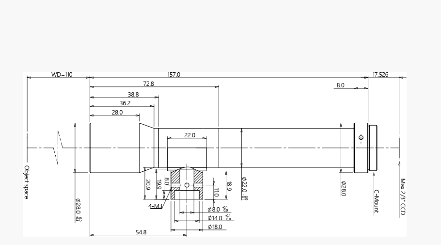 COOLENS 视清 WWH60-110CT 远心镜头 基本参数 支持CCD尺寸(Φmm) 11.0(2/3") 放大倍率β(x) 6 物方工作距WD(mm) 110±2 像方F/# 38.9 物方景深DOF(mm) 0.1 像方畸变(% max) <0.1 物方远心度(° max) <0.1 镜头总长(mm) 157.0 镜头接口 C-Mount 物方分辨率(μm) 4.5 数值孔径 NA 0.075 是否同轴光 是 可变光栏 无 视野范围 (mmxmm) 1/2" (6.4x4.8) 1.1x0.8 1/1.8" (7.13x5.37) 1.2x0.9 2/3" (8.8x6.6) 1.5x1.1 手机/微信:13682357734 电话:0755-84690029 QQ: 2844337877 邮箱:2844337877@qq.com...