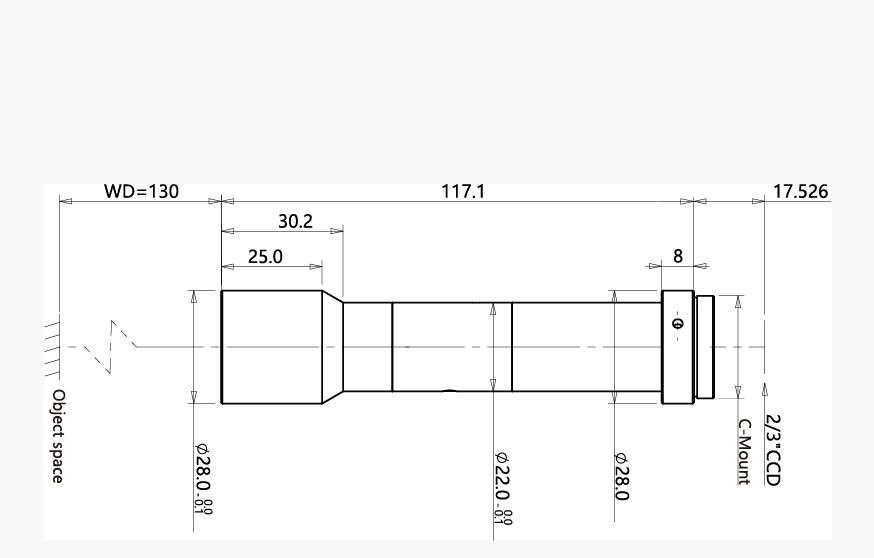 COOLENS 视清 WWH08-130AT 远心镜头 基本参数 支持CCD尺寸(Φmm) 11.0(2/3") 放大倍率β(x) 0.8 物方工作距WD(mm) 130±2 像方F/# 12.6 物方景深DOF(mm) 1.6 像方畸变(% max) <0.1 物方远心度(° max) <0.1 镜头总长(mm) 117.1 镜头接口 C-Mount 物方分辨率(μm) 10.6 数值孔径 NA 0.0316 是否同轴光 否 可变光栏 无 视野范围 (mmxmm) 1/2" (6.4x4.8) 8.0x6.0 1/1.8" (7.13x5.37) 8.9x6.7 2/3" (8.8x6.6) 11.0x8.3 手机/微信:13682357734 电话:0755-84690029 QQ: 2844337877 邮箱:2844337877@qq.com...