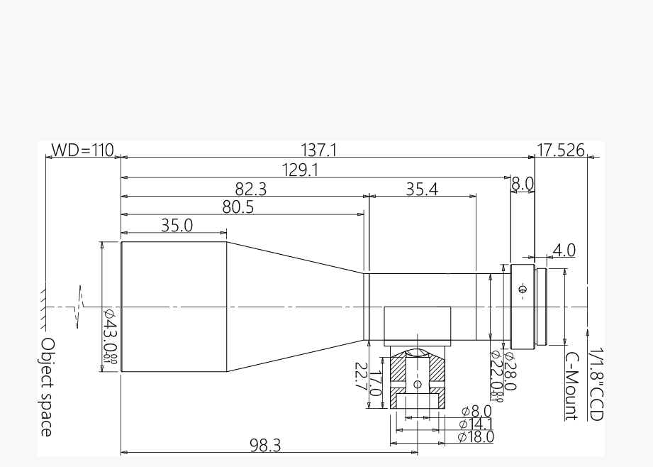 COOLENS 视清 WWH03-110CT 远心镜头 基本参数 支持CCD尺寸(Φmm) 9.0(1/1.8") 放大倍率β(x) 0.3 物方工作距WD(mm) 110±2 像方F/# 9 物方景深DOF(mm) 8.0 像方畸变(% max) <0.1 物方远心度(° max) <0.1 镜头总长(mm) 137.1 镜头接口 C-Mount 物方分辨率(μm) 20.1 数值孔径 NA 0.0167 是否同轴光 是 可变光栏 无 视野范围 (mmxmm) 1/2" (6.4x4.8) 21.3x16.0 1/1.8" (7.13x5.37) 23.8x17.9 1/3" (4.8x3.6) 16.0x12.0 手机/微信:13682357734 电话:0755-84690029 QQ: 2844337877 邮箱:2844337877@qq.com...