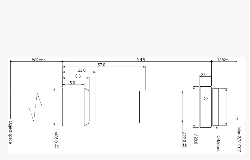 COOLENS 视清 WWH40-65AT 远心镜头 基本参数 支持CCD尺寸(Φmm) 11.0(2/3") 放大倍率β(x) 4 物方工作距WD(mm) 65±1 像方F/# 17.9 物方景深DOF(mm) 0.1 像方畸变(% max) <0.1 物方远心度(° max) <0.1 镜头总长(mm) 101.9 镜头接口 C-Mount 物方分辨率(μm) 3.1 数值孔径 NA 0.1078 是否同轴光 否 可变光栏 无 视野范围 (mmxmm) 1/2" (6.4x4.8) 1.6x1.2 1/1.8" (7.13x5.37) 1.8x1.3 2/3" (8.8x6.6) 2.2x1.7 手机/微信:13682357734 电话:0755-84690029 QQ: 2844337877 邮箱:2844337877@qq.com...