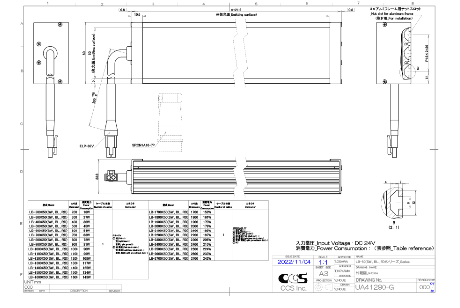 CCS希希爱视 LB-600X50RD 条形光源 LED发光颜色 LB-600X50RD: RedLB-600X50SW: WhiteLB-600X50BL: Blue 相关色温 LB-600X50SW: 6300 K typ. 峰值发光波长 LB-600X50RD: 630 nm typ.LB-600X50BL: 467 nm typ. 外观尺寸 W 621.2 mm x D 60 mm x H 33.6 mm 输入电压 24 VDC 消耗功率 54 W 极性, 信号 1: (+), 2: (-) 线缆长度 300 mm 外壳材质 Aluminum alloy, Steel sheet 输入端口 ELP-02V 适合规格 CE, UKCA, RoHSIEC 624711LB-600X50RD : ExemptLB-600X50SW : ExemptLB-600X50BL : Exempt 使用温湿度 Temperature: 0 to 40°C, Humidity: 20 to 85%RH (with no condensation) 保存温湿度 Temperature: -20 to 60°C, Humidity: 20 to 85%RH (with no condensation) 冷却方式 Natural air-cooling 重量 1.03 kg 附属品 使用说明书 备注 LB-600X50BL is made to order. Please co...