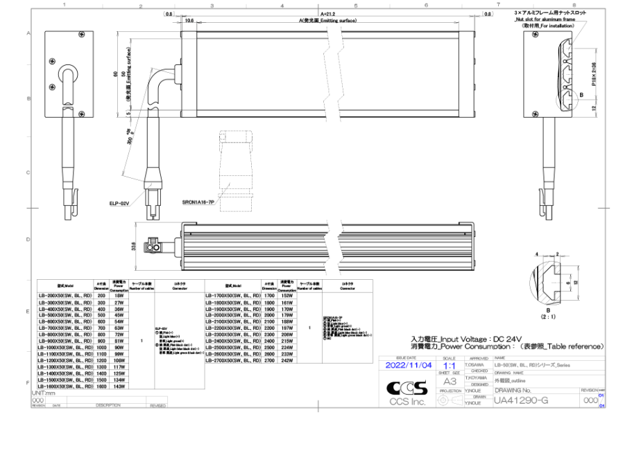 CCS希希爱视 LB-500X50SW 条形光源 LED发光颜色 LB-500X50RD: RedLB-500X50SW: WhiteLB-500X50BL: Blue 相关色温 LB-500X50SW: 6300 K typ. 峰值发光波长 LB-500X50RD: 630 nm typ.LB-500X50BL: 467 nm typ. 外观尺寸 W 521.2 mm x D 60 mm x H 33.6 mm 输入电压 24 VDC 消耗功率 45 W 极性, 信号 1: (+), 2: (-) 线缆长度 300 mm 外壳材质 Aluminum alloy, Steel sheet 输入端口 ELP-02V 适合规格 CE, UKCA, RoHSIEC 624711LB-500X50RD : ExemptLB-500X50SW : ExemptLB-500X50BL : Exempt 使用温湿度 Temperature: 0 to 40°C, Humidity: 20 to 85%RH (with no condensation) 保存温湿度 Temperature: -20 to 60°C, Humidity: 20 to 85%RH (with no condensation) 冷却方式 Natural air-cooling 重量 0.89 kg 附属品 使用说明书 备注 LB-500X50BL is made to order. Please contact your sales representat...