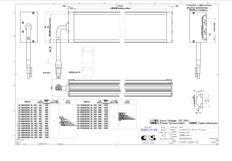 CCS希希爱视 LB-200X50RD 条形光源 LED发光颜色 LB-200X50RD: RedLB-200X50SW: WhiteLB-200X50BL: Blue 相关色温 LB-200X50SW : 6300 K typ. 峰值发光波长 LB-200X50RD: 630 nm typ.LB-200X50BL: 467 nm typ. 外观尺寸 W 221.2 mm x D 60 mm x H 33.6 mm 输入电压 24 VDC 消耗功率 18 W 极性, 信号 1: (+), 2: (-) 线缆长度 300 mm 外壳材质 Aluminum alloy, Steel sheet 输入端口 ELP-02V 适合规格 CE, UKCA, RoHSIEC 624711LB-200X50RD : ExemptLB-200X50SW : ExemptLB-200X50BL : Exempt 使用温湿度 Temperature: 0 to 40°C, Humidity: 20 to 85%RH (with no condensation) 保存温湿度 Temperature: -20 to 60°C, Humidity: 20 to 85%RH (with no condensation) 冷却方式 Natural air-cooling 重量 0.47 kg 附属品 使用说明书 备注 LB-200X50BL is made to order. Please contact your sales re...