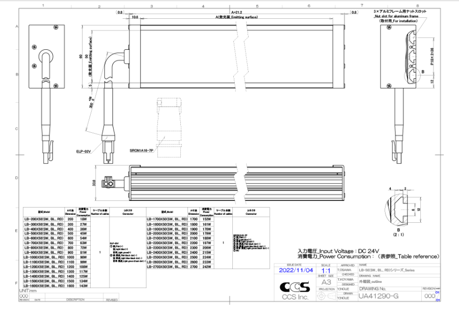 CCS希希爱视 LB-2700X50SW 条形光源 LED发光颜色 LB-2700X50RD: RedLB-2700X50SW: WhiteLB-2700X50BL: Blue 相关色温 LB-2700X50SW: 6300 K typ. 峰值发光波长 LB-2700X50RD: 630 nm typ.LB-2700X50BL: 467 nm typ. 外观尺寸 W 2721.2 mm x D 60 mm x H 33.6 mm 输入电压 24 VDC 消耗功率 242 W 极性, 信号 1, 2, 3: (+)/4, 5, 6: (-)/7: NC 线缆长度 300 mm 外壳材质 Aluminum alloy, Steel sheet 输入端口 SRCN1A16-7P 适合规格 CE, UKCA, RoHSIEC 624711LB-2700X50RD : ExemptLB-2700X50SW : ExemptLB-2700X50BL : Exempt 使用温湿度 Temperature: 0 to 40°C, Humidity: 20 to 85%RH (with no condensation) 保存温湿度 Temperature: -20 to 60°C, Humidity: 20 to 85%RH (with no condensation) 冷却方式 Natural air-cooling 重量 3.97 kg 附属品 使用说明书 备注 LB-2700X50SW / LB-2700...