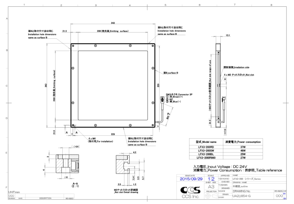 CCS希希爱视 LFX3-200BL 平面无影光源 LED发光颜色 Blue 峰值发光波长 469 nm typ. 外观尺寸 W 243 mm x D 243 mm x H 13.1 mm 输入电压 24 VDC 消耗功率 25 W max. 极性, 信号 1: (+), 2: NC, 3: (-) 线缆长度 300 mm 外壳材质 Aluminum alloy, Resin (protective plate, light-guiding diffusion plate) 输入端口 SMR-03V-B 适合规格 CE, UKCA, RoHS, IEC 62471(Exempt) 使用温湿度 Temperature: 0 to 40°C, Humidity: 20 to 85%RH (no condensation) 保存温湿度 Temperature: -20 to 60°C, Humidity: 20 to 85%RH (no condensation) 冷却方式 Natural air-cooling 重量 910 g max. 附属品 使用说明书 手机/微信:13682357734 电话:0755-84690029 QQ: 2844337877 邮箱:2844337877@qq.com...