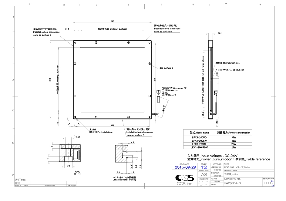CCS希希爱视 LFX3-200RD 平面无影光源 LED发光颜色 Red 峰值发光波长 632 nm typ. 外观尺寸 W 243 mm x D 243 mm x H 13.1 mm 输入电压 24 VDC 消耗功率 37 W max. 极性, 信号 1: (+), 2: NC, 3: (-) 线缆长度 300 mm 外壳材质 Aluminum alloy, Resin (protective plate, light-guiding diffusion plate) 输入端口 SMR-03V-B 适合规格 CE, UKCA, RoHS, IEC 62471(Exempt) 使用温湿度 Temperature: 0 to 40°C, Humidity: 20 to 85%RH (no condensation) 保存温湿度 Temperature: -20 to 60°C, Humidity: 20 to 85%RH (no condensation) 冷却方式 Natural air-cooling 重量 910 g max. 附属品 使用说明书 手机/微信:13682357734 电话:0755-84690029 QQ: 2844337877 邮箱:2844337877@qq.com...